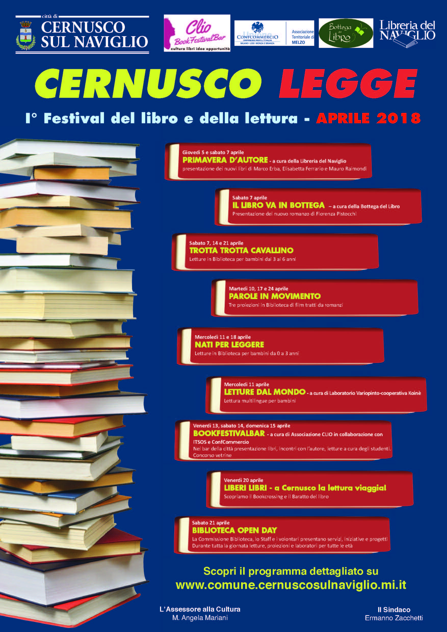 Cernusco sul Naviglio, 28 marzo 2018 – Un mese intero ricco di appuntamenti dedicato agli amanti del libro e della lettura: nasce grazie sotto la regia dell’assessorato alla Cultura, insieme a associazioni del territorio e librerie cernuschesi la prima edizione di ‘Cernusco legge’, Festival del libro e della lettura.