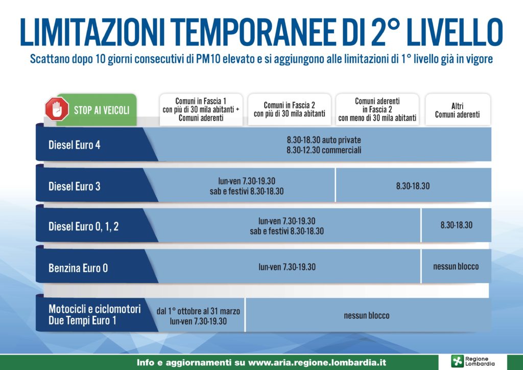 Le misure temporanee di 2° livello comprendono tutte quelle di 1° livello ma sono più restrittive sul traffico e sui riscaldamenti.