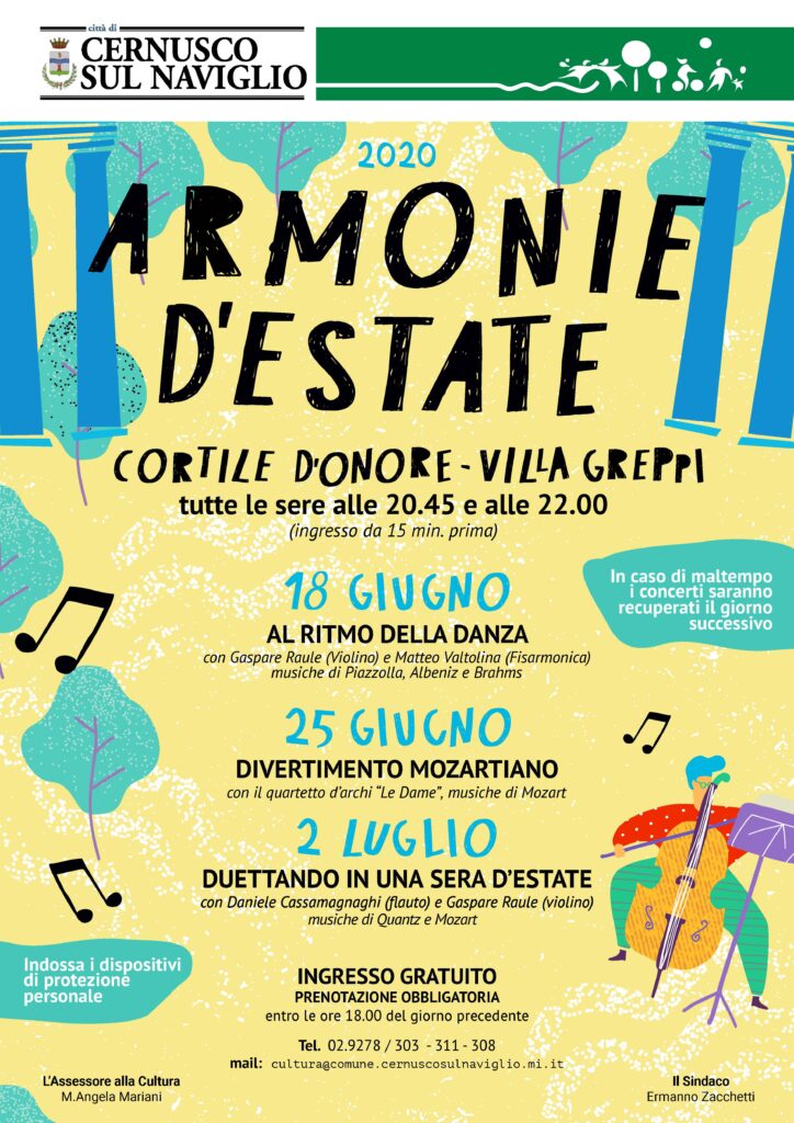 A partire dal prossimo giovedì 18 giugno e per le successive due settimane, tre concerti di musica classica si terranno nel cortile della villa comunale: “Armonie d’estate” il titolo della rassegna, con la presenza di alcuni dei musicisti che si sarebbero dovuti esibire nei concerti programmati a marzo ed aprile alla Casa delle Arti.
