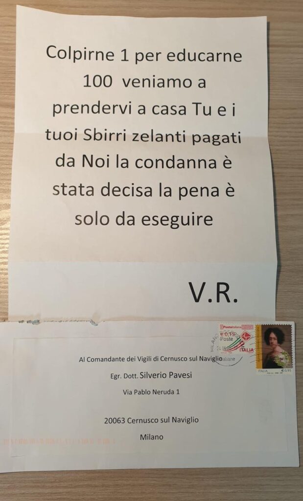 Il testo lascia poco spazio a interpretazioni: “Colpirne 1 per educarne 100 veniamo a prendervi a casa Tu e i tuoi sbirri zelanti pagati da Noi la condanna è stata decisa la pena è solo da eseguire. V.R.”