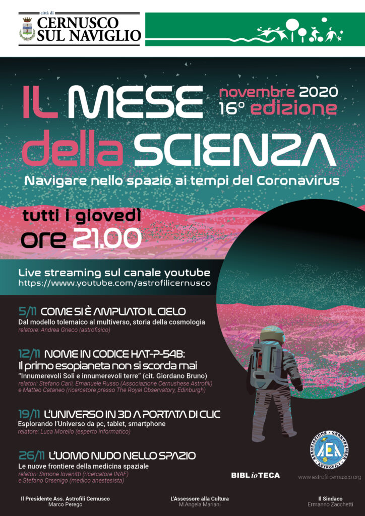 Torna come ogni anno Il mese della scienza, ciclo di conferenze di carattere scientifico che, per il 16° anno, l’Associazione Cernuschese Astrofili organizza in collaborazione con la Biblioteca di Cernusco sul Naviglio, con una novità: a causa dell’emergenza sanitaria tutti gli incontri saranno trasmessi in streaming sul canale youtube dell’associazione.
