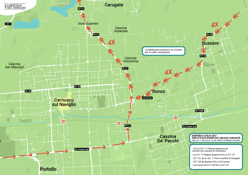 Martedì 6 luglio dalle ore 11.30 alle ore 15.30 l’edizione 2021 del ‘Giro d’Italia donne’ con partenza Milano e arrivo a Carugate, attraverserà anche la nostra Città.