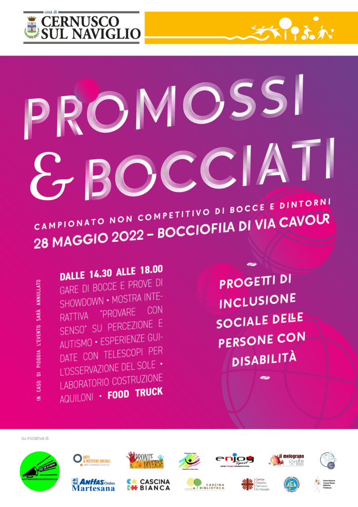 Il prossimo sabato 28 maggio 2022, presso i campi da bocce di via Cavour, dalle 14.30 alle 18.00 il Tavolo di coordinamento Cia’ Ke Si Gira, punto d’incontro tra le varie anime del terzo settore di Cernusco sul Naviglio (volontariato, associazionismo e imprenditorialità sociale) propone un evento all’aria aperta dedicato all’incontro e alla condivisione per persone con disabilità ma aperto a chiunque voglia trascorrere un pomeriggio con attività, giochi ed esperienze non convenzionali.