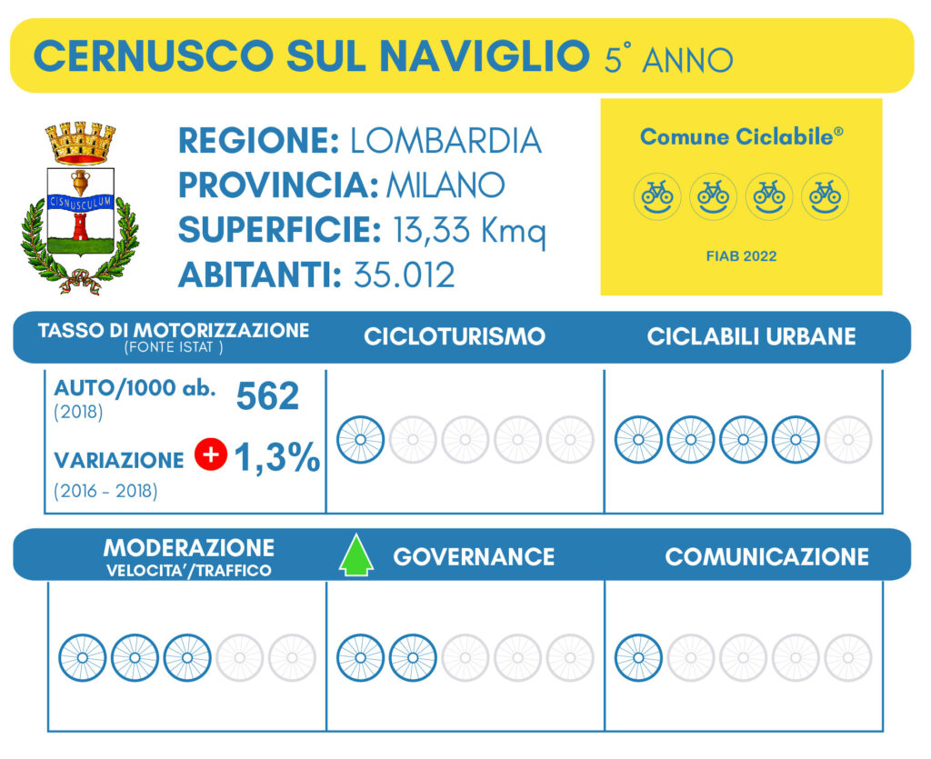 Si è chiusa ieri – con la consegna virtuale delle tradizionali bandiere gialle – l’edizione 2022 di FIAB ComuniCiclabili che, al suo quinto anno, supera i 174 comuni italiani partecipanti. Cinque anni dell’iniziativa dedicata alla promozione della ciclabilità e cinque anni di presenza per Cernusco sul Naviglio, che si aggiudica nuovamente quattro ‘bike-smile’ su cinque, a conferma della sua vocazione per le due ruote.