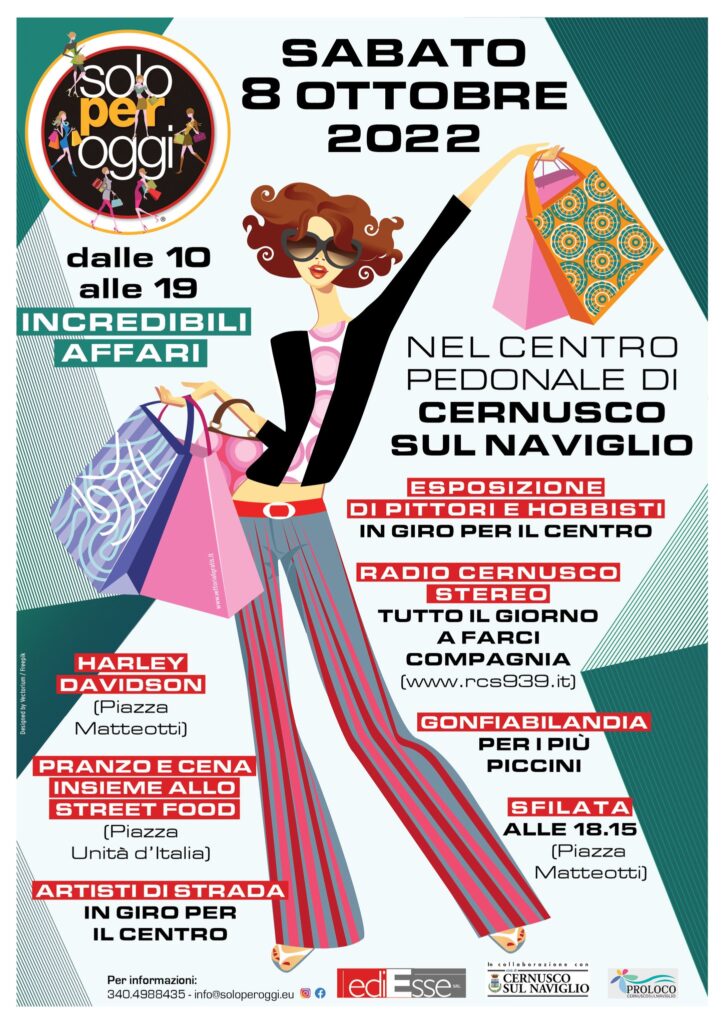 Dalle 10:00 alle 19:00 di sabato 8 ottobre 2022 vie e piazze del centro storico ospitano la manifestazione Soloperoggi, organizzata de Ediesse in collaborazione con Comune e Pro Loco di Cernusco sul Naviglio, con musica, artisti di strada, buon cibo e tante occasioni per lo shopping e il divertimento dedicato alle famiglie.