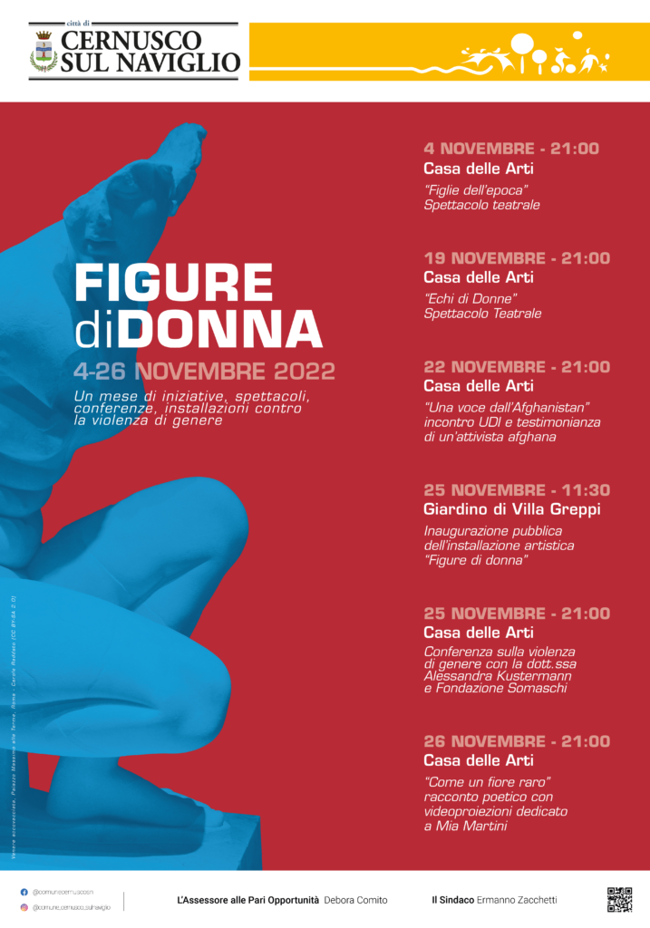 Si chiama “Figure di donna” e andrà avanti per tutto il mese di novembre la rassegna organizzata dagli Assessorati alle Pari opportunità e alla Cultura del Comune di Cernusco sul Naviglio in occasione del 25 novembre, Giornata internazionale per l’eliminazione della violenza contro le donne. Un mese di conferenze, spettacoli, incontri e installazioni per affrontare il tema da più prospettive, dire no alla violenza e sensibilizzare la cittadinanza.