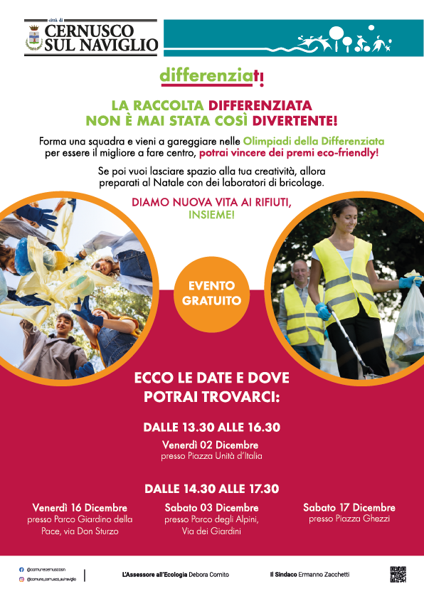 “Nessun rifiuto!”, invece, è stato un laboratorio creativo portato nelle piazze, rivolto a famiglie e cittadini con l’obiettivo di divulgare l’idea che un rifiuto può essere anche una risorsa e che quindi è importante svolgere adeguatamente la raccolta differenziata per dare nuova vita agli oggetti. Olimpiadi della differenziata, laboratori e attività educative.