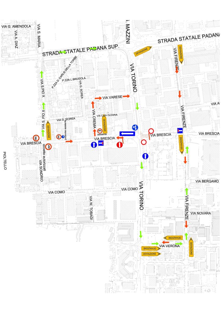 Continua ad essere garantita la circolazione in entrambe le direzioni di marcia lungo via Torino, sia in direzione Nord verso il centro cittadino sia verso Sud, in direzione Pioltello. Vietata la svolta sul ramo ovest di via Brescia provenendo da entrambe le direzioni, mentre sarà possibile svoltare sul ramo est di via Brescia solo se provenienti da Sud. Si prega di prestare attenzione a eventuali segnali di divieto di sosta e di deviazione indicati. Maggiori informazioni sul piano di deviazioni previsto per il quadrante disponibili nell’ordinanza disponibile in allegato.