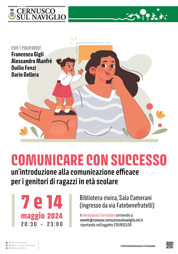Un’introduzione alla comunicazione efficace per i genitori di ragazzi in età scolare. Il 7 e 14 maggio 2024, dalle 20:30 alle 23:00 due incontri con counselor specializzati presso la Biblioteca civica di Cernusco sul Naviglio, (Sala Camerani, ingrasso da via Fatebenefratelli). È necessaria l’iscrizione scrivendo una mail a eventi@comune.cernuscosulnaviglio.mi.it riportando nell’oggetto COUNSELOR.