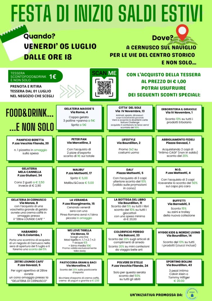 È tempo di saldi! Il prossimo giovedì 18 luglio 2024 i negozi cernuschesi potranno restare aperti fino alle 23:00 e oltre ai ribassi di fine stagione, tantissimi sconti speciali (richiedi la tessera nei negozi aderenti) grazie al Comitato Commercio e Artigianato di Cernusco sul Naviglio.