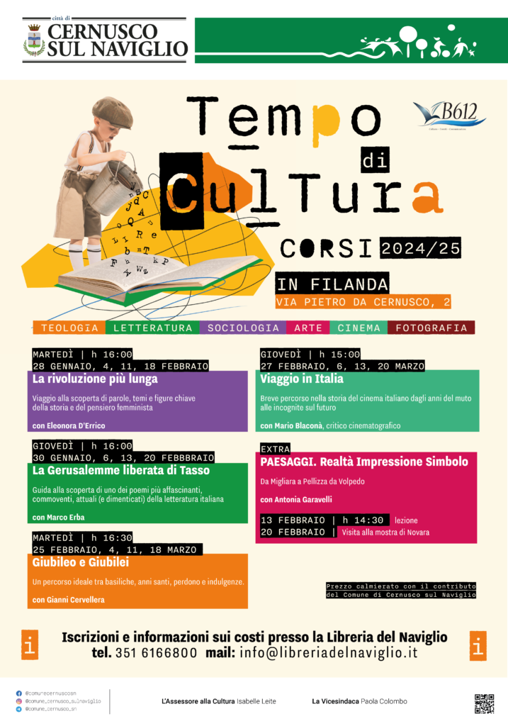 In Filanda è di nuovo Tempo di Cultura! Ritorna per l’anno 2024/25 la collaborazione del Comune di Cernusco sul Naviglio con B612 per i corsi su storia, letteratura, spiritualità, sociologia, arte e filosofia con la proposta di approfondimento culturale pomeridiana.