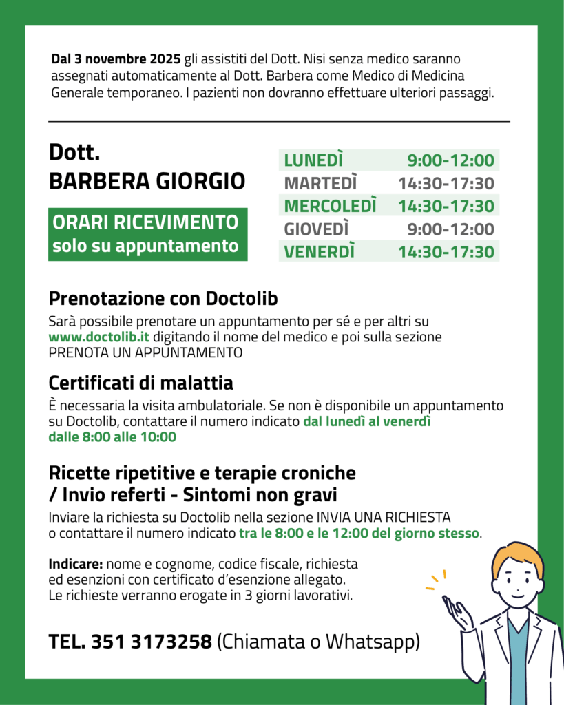 Condividiamo la comunicazione diffusa dall’ASST Melegnano e della Martesana: dal prossimo 3 novembre 2025, il Dott. Nisi sarà sostituito dal Medico di Medicina Generale temporaneo, Dott. Barbera. I pazienti saranno assegnati automaticamente al medico temporaneo e non dovranno eseguire ulteriori passaggi.