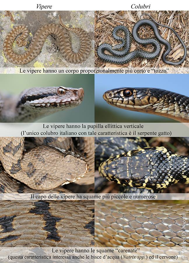 La principale differenza con la vipera (che nella nostra zona non è comunemente presente) sta nella pupilla: rotonda per la biscia, ellittica per la vipera; e nella testa unita al corpo e tondeggiante per la biscia e distinta dal corpo e di forma triangolare per la vipera.