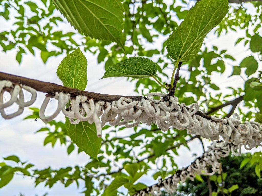 È facilmente riconoscibile durante la fine del periodo riproduttivo grazie ai caratteristici ovisacchi bianchi dall’aspetto cotonoso, tubolari, formanti anelli lunghi da 4 a 5 cm di colore bianco. Dalle prime osservazioni condotte in Lombardia l’insetto si riproduce una sola volta all’anno in primavera, verso fine aprile inizio maggio. Ma i problemi maggiori sono causati dagli insetti in giovane età che si posizionano sulla parte inferiore delle foglie provocando, nei casi di infestazione più grave, danni a gemme e germogli.