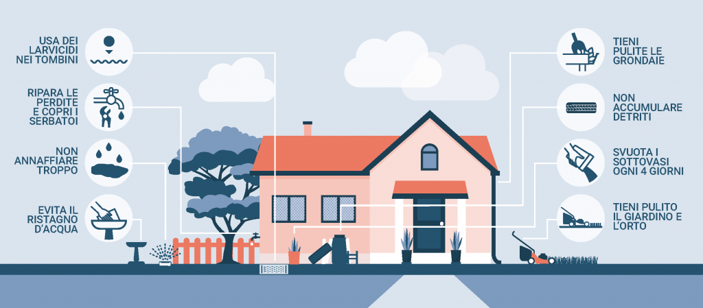 - non abbandonare oggetti e contenitori di qualsiasi natura e dimensioni dove possa raccogliersi l’acqua piovana, come copertoni, bottiglie, teli di plastica, sottovasi di piante e simili e verificarne lo svuotamento periodico, pulizia e chiusura con teli di plastica o coperchi