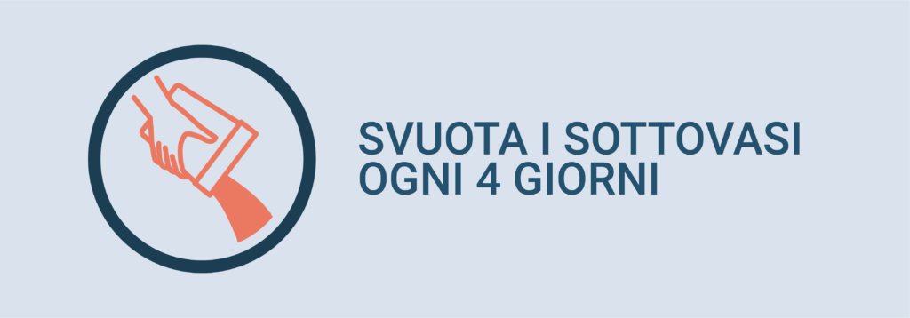 - evitare la formazione di raccolte d’acqua nei contenitori di uso comune (vaschette di condensa degli impianti di condizionamento, evaporatori dei caloriferi ad impianto di riscaldamento spento, sottovasi, piccoli abbeveratoi per animali domestici, recipienti domestici, secchi, innaffiatoi, ecc), o comunque provvedere al loro svuotamento periodico (3-4 giorni). Le zanzare depongono le uova sui bordi di questi contenitori, quindi può essere utile pulirne le pareti circa una volta alla settimana